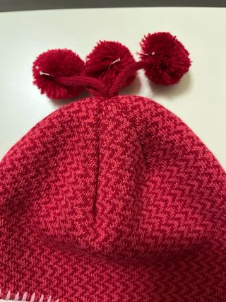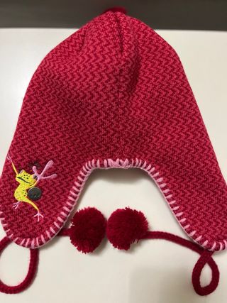 Gorro de punto para niña, ideal para mantenerla abrigada en los días fríos. Presenta un divertido diseño. - Tejido de punto con estampado. - Detalle de pompón en la parte superior. - Adorno de un aplique de rana. - Cintas con pompones para atar.