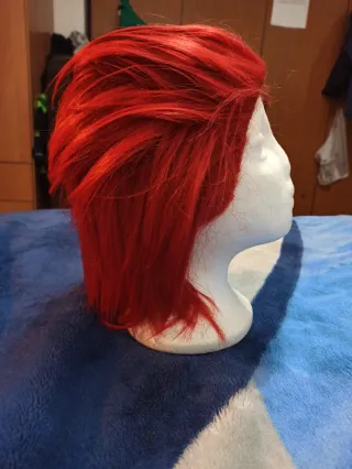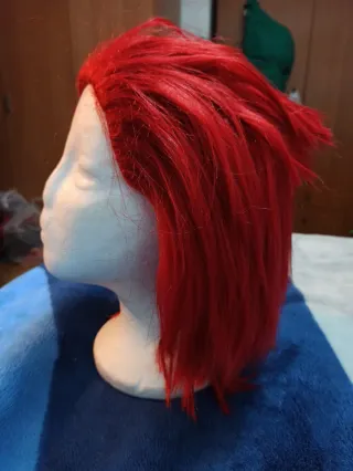 Peluca de pelo sintético de color rojo. De fibra sintética algo rígida para plantar los mechones como en la última foto (esa es exactamente la que compré), aunque a mí me costó bastante. Con cintas elásticas interiores para mejor ajuste. Es talla única, recomiendo para adolescentes o adultos, creo que es grande para infantil. #disfraz#anime