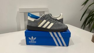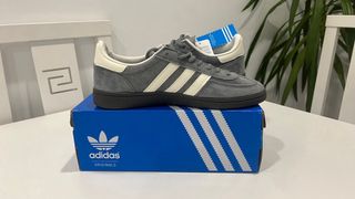 Zapatillas Adidas Spezial en color gris con detalles en blanco. Un clásico con un diseño atemporal. - Parte superior de ante. - Tres rayas icónicas de Adidas en blanco. - Detalle Spezial en dorado.