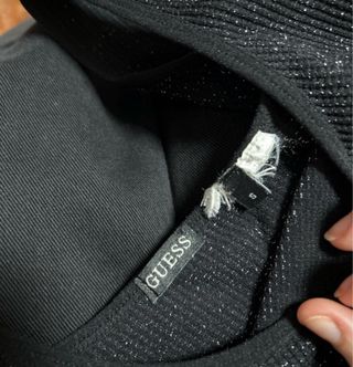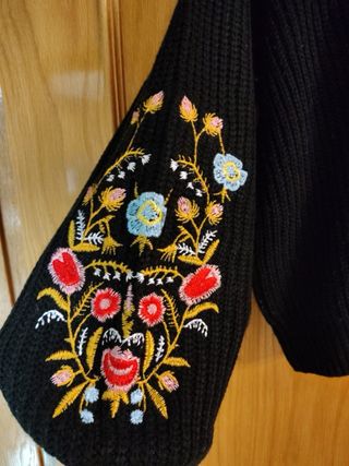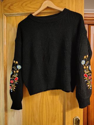 Jersey de punto negro con un bonito detalle bordado de flores en las mangas. - Diseño de cuello redondo. - Manga larga. - Puños y bajo acanalados.