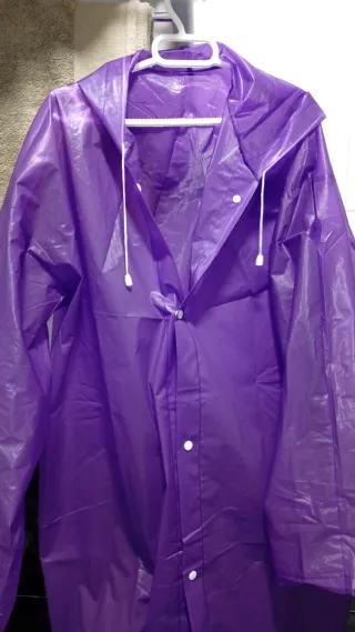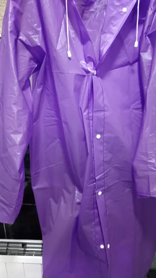 Chubasquero ideal para la lluvia, de un llamativo color morado. - Cierre de botones. - Capucha con cordón ajustable. - Mangas largas.