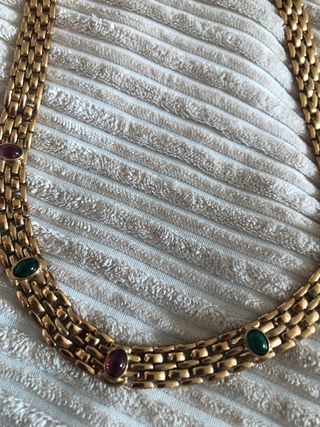 Elegante gargantilla de bisutería con un diseño de cadena dorada y detalles de piedras de colores. Gastos de envío por cuenta de la compradora. - Cadena de eslabones dorados. - Piedras incrustadas en tonos verdes y púrpuras.
