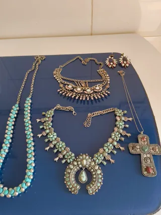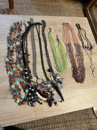 1x cadena con cuerdas en negro y plata y detalle circulo de cristal de murano con detalle floral. 1x gargantilla perlas bolas blancas 1x gargantilla étnico con detalles tipo cuentas o bolitas en negro y bronce 1x pendientes monedas chapitas en diferentes metales envejecidos bronce y plata 1x pendientes aro con bolitas en color blanco y dorado 1x pendientes colgantes madera de diferentes tonos tierra: naranja, bronce… 1x colgante tipo perla 1x anillo verde plástico trasparente ajustable detalle luna y estrella 1x anillo conejo ( ligeramente desgastado) 1 x anillo cuadrado con piedra redond
