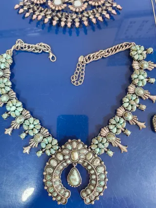 Elegante gargantilla de bisutería con un diseño llamativo. La parte metálica está un poco desgastada por el uso - Cadena dorada con detalles en verde. - Piedras de color azul turquesa. - Colgantes en forma de lágrima.