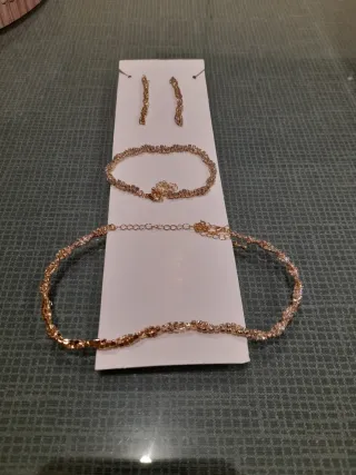 Elegante conjunto de bisutería con un acabado dorado brillante. Incluye pendientes,pulsera y gargantilla ajustables. - Diseño delicado y adornado con pequeñas gemas. - Cierre de mosquetón en las pulseras para un ajuste seguro. - Ideal para añadir un toque de brillo a cualquier atuendo.
