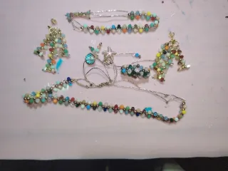 Conjunto de bisutería artesanal con un diseño vibrante y alegre. - Pulsera ajustable con cuentas de cristal y detalles metálicos. - Anillo a juego con un surtido de cuentas y un pequeño adorno en forma de estrella , la pulsera también lleva las estrellas en las puntas. - gargantilla y tobillera a juego . Pregunta precios sin compromiso Te lo hago a tu gusto o si es para regalo daremos con los gustos de su dueñ@