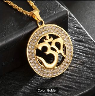 *** GRAN OFERTA: Compra 10 artículos y obtén un 50% de descuento en el precio total *** Preciosa gargantilla con dije de Om. Es un colgante dorado con brillantes incrustados. - Elegante diseño circular. - Dije con símbolo Om. - Cadena de eslabones tipo cuerda.