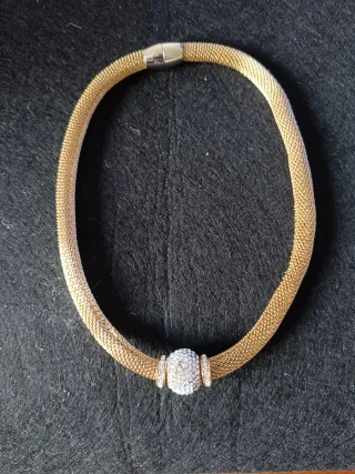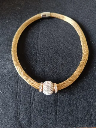 Elegante gargantilla dorada con un detalle central de pedrería, ideal para estás próximas fiestas. - Diseño tipo malla. - Cierre magnético. - Adorno esférico con incrustaciones brillantes. - Broche imantado.