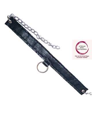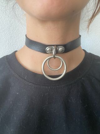 - Preciosa gargantilla de cuero sintético negro con un aro y cadena metálicos. - Se encuentra en buen estado. - Material: Cuero sintético y metal. - Diseño elegante y moderno. - Ideal para complementar cualquier atuendo. - Collar/gargantilla de piel sintética con aro de metal de 2.5 cm. - Elaborada de forma artesanal,cosido a mano con hilo negro. - Apto para veganos. - MEDIDA: 27 cm. a 46 cm. - Este artículo se realiza bajo demanda. Se puede realizar personalizado. El tiempo de realización es de 5 a 7 días. - PARA TU ARTÍCULO PERSONALIZADO PONTE EN CONTACTO CONMIGO EN PRIVADO O LOS DATOS DE LA PUBLICACIÓN/PERFIL.
