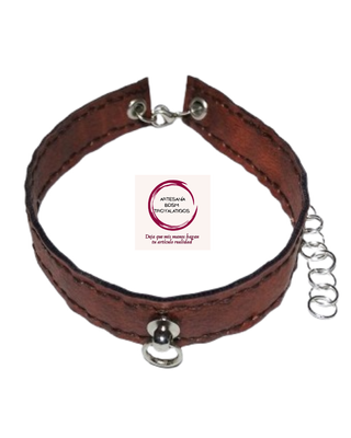 Gargantilla de cuero con remache con aro metálico. - Cierre de mosquetón. - Cadena extensible. - Remaches de seguridad. Gargantilla de piel sintética marrón cosida a mano. Apta para veganos. MEDIDAS: Polipiel: 27 cm. x 2 cm. Contorno: 27,5 cm. a 42 cm. Este artículo se realiza bajo demanda. Se puede realizar personalizado. El tiempo de realización estimado es de 5 a 7 días. PARA TU ARTÍCULO PERSONALIZADO PONTE EN CONTACTO CONMIGO EN: - DESDE TIENDA ONLINE: Nota al vendedor o privado. - CORREO ELECTRÓNICO:Troyalatigos@hotmail.com -INSTAGRAM: @troyalatigos