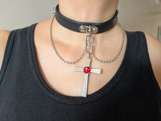 Gargantilla gótica cruz con perla roja. Cierre apto para distintos anchos de cuello (tercera y cuarta foto). Medida: 38cm de largo de la tira de cuero Tags: gótica, goth, dark alternative, alternativo, dark aesthetic, collar - Gargantilla de cuero negro. - Cadena de eslabones plateados. - Colgante de cruz plateada con gema roja.