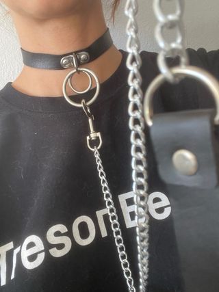 Collar tipo gargantilla de cuero negro con detalles plateados y una cadena colgante. la cadena está sin usar y el collar poco uso - Diseño con anillas metálicas. - Cierre de hebilla ajustable.
