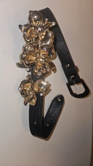 Elegante gargantilla con un diseño floral llamativo. - Adornado con flores doradas y detalles de cristales. - Correa de cuero negro.