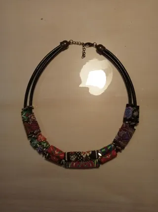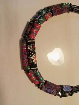 Gargantilla de estilo étnico con un diseño llamativo. HECHO A MANO - Base de cuero. - Elementos centrales de tela con estampados variados. - Cierre de cadena ajustable.