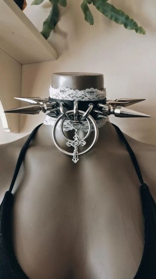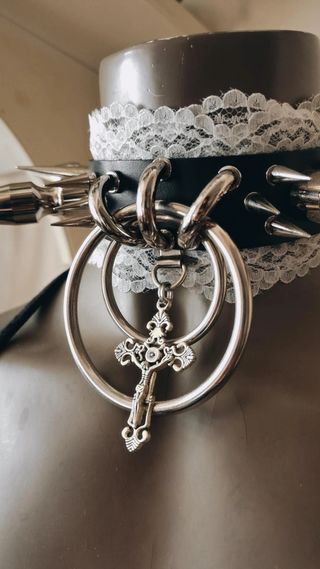 Preciosa gargantilla de estética dark. Está en perfecto estado. - Collar de cuero negro con encaje blanco. - Incorpora dos aros metálicos y una cruz. - Adornado con pinchos metálicos. - Cierre trasero ajustable con hebilla.