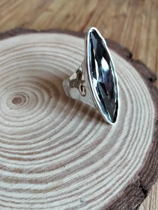 Anillo de metal plateado antique con cristal color antracita. IMITACIÓN. Bisutería, anillo, pendientes, pulsera, cuero, plateado, gargantilla. Descuento por compras y packs.