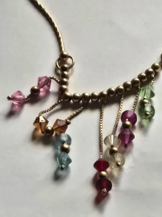 Elegante gargantilla de oro 750 con un diseño único y adornos de cuentas de cristal en varios colores. - Diseño con cuentas de cristal facetadas. - Colgantes con cuentas de cristal en tonos rosa, ámbar, azul, morado, transparente y verde. - Cadena fina de oro 750.