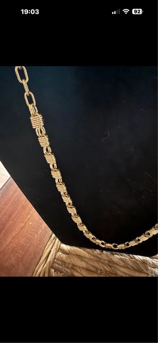 Elegante collar gargantilla con eslabones entrelazados en tonos dorados y plateados. - Diseño de cadena con eslabones retorcidos. - Detalles de eslabones ovalados dorados. - Colgantes variados con motivos. - Cierre de mosquetón.