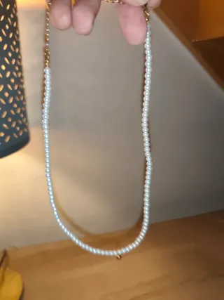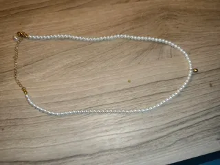 Elegante gargantilla de perlas con detalles dorados y plateados. - Perlas pequeñas y uniformes. - Cierre de mosquetón. - Diseño delicado y moderno.