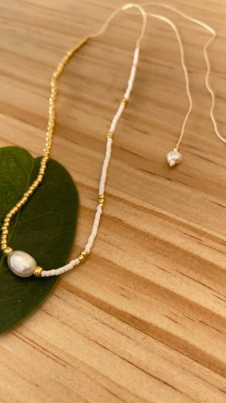 Elegante collar con un diseño delicado y moderno. - Cuenta con una perla central de forma irregular. - Combina cuentas blancas y doradas. - Cierre ajustable se ouede llevar largo o como gargantilla