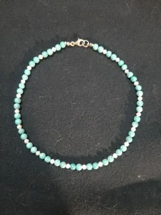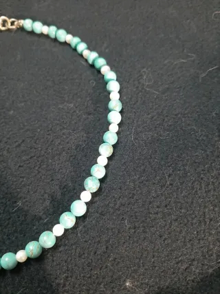 Elegante gargantilla con cuentas de turquesa y perlas. - Diseño delicado y llamativo. - Cierre de plata. - Combina turquesas y perlas blancas.