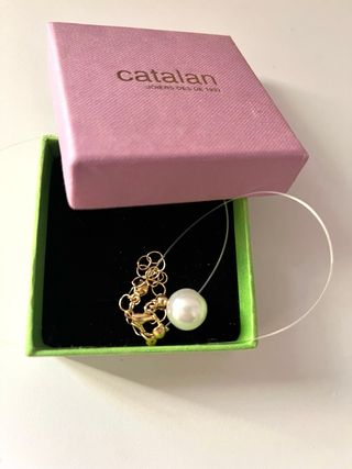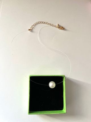 Collar, colgante de hilo transparente con cadena dorada para el cierre. Perla blanca como piedra principal. Lleva caja, ideal para regalar