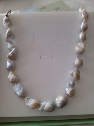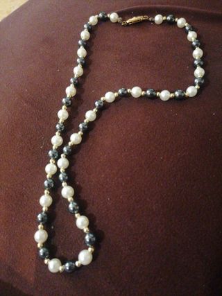 el más largo es nácar y perlas grises , la gargantilla el material es que no se hace negro, el otro collar antiguo las perlas pequeñas Debido al roce de las piedras muy pequeñas picaduras apenas se notan hago envíos por wallapop ver fotos si te llevas los tres seis euros