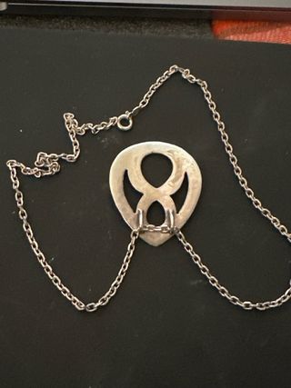 Preciosa gargantilla de estilo único. Se compone de un colmillo de color beige y una pieza central de plata de diseño trabajado. La cadena es de plata. Es una pieza llamativa y elegante. - Material: Plata y colmillo. - Diseño: Colmillo con colgante de plata. - Estado: Usado, en buenas condiciones.