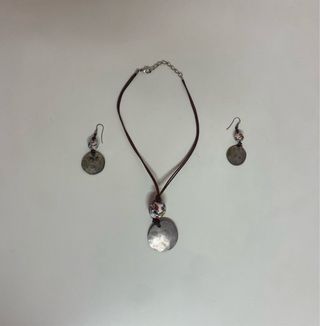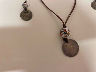 Preciosa gargantilla y pendientes de estilo boho chic. Ideales para darle un toque especial a tu look. - La gargantilla tiene un cordón marrón y dos colgantes: una pieza redonda plateada y una cuenta de cerámica con estampado floral. - Los pendientes combinan con el collar, con una pieza redonda plateada y una cuenta. - Son dos piezas únicas, perfectas para un regalo o para ti misma.