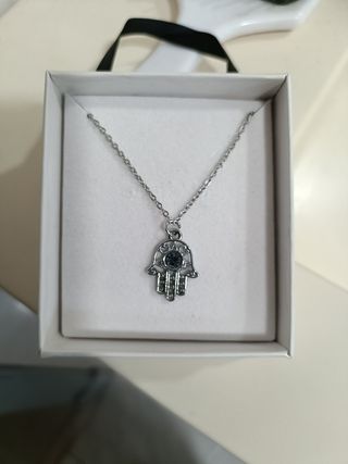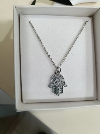 Preciosa gargantilla con dije de mano de Fátima. Es un colgante delicado y elegante. - Material: Plata. - Diseño: Mano de Fátima con detalles.