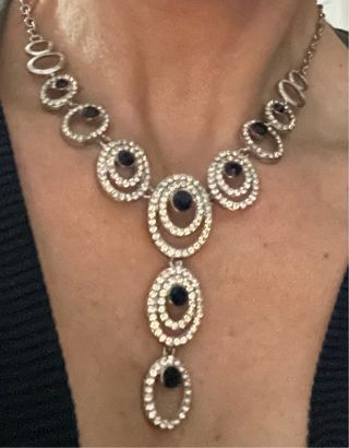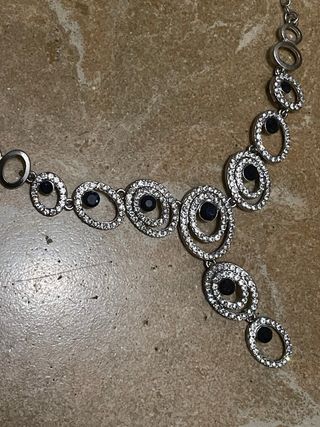 Elegante gargantilla con un diseño llamativo. - Cadena con eslabones circulares. - Colgante central con múltiples aros y piedras oscuras. - Detalles brillantes alrededor de las piedras.