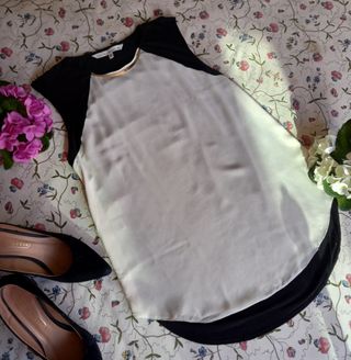 Top elegante/sport de Rachel Roy. La parte delantera es de gasa con doble capa y la parte trasera en algodón muy suave y fino. Lleva detalle metálico dorado en el cuello a modo de Gargantilla. Muy buen estado (pequeñísimo defecto en el pecho que puesto ni se nota, de hecho ni cuesta verlo en la última foto). Utilizado en una ocasión. Muy fino y elegante. Medidas: Hombros 37 Pecho 45 Largo 65-73