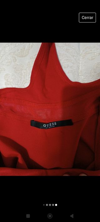 Vestido de la marca GUESS, PRACTICAMENTE NUEVO. DE LA TALLA M. Con una cinta que va abotonada al cuello a modo de gargantilla y varias tiras de tejido transparente en el abdomen y en el escote. Tejido elástico.