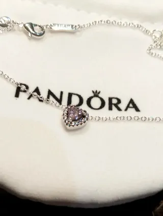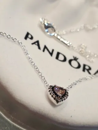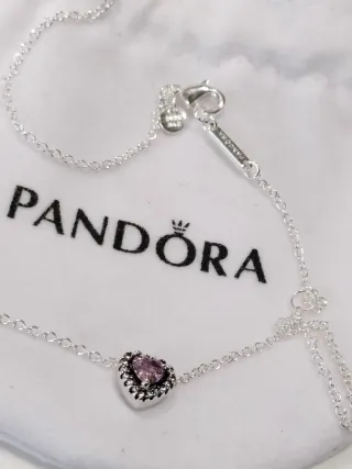 Preciosa gargantilla de plata de la marca Pandora. Incluye un colgante en forma de corazón con un grabado. -Cadena fina y delicada. -Colgante pequeño con forma de corazón. -Grabado discreto y elegante.