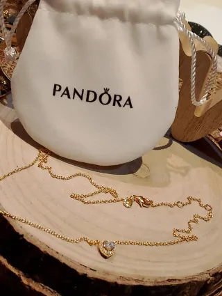 Elegante conjunto de cadena y colgante de la marca Pandora. Se puede llevar en pulsera o gargantilla. - Diseño de ala de mariposa. - Acabado en tono dorado.Solo vendo en mano zona sur de Madrid
