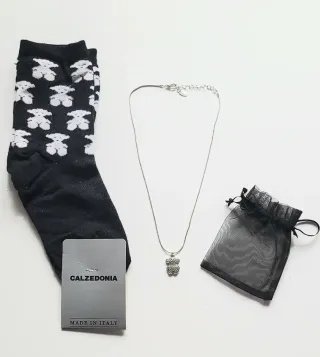 Gargantilla de la marca LBVYR en rodio, con colgante imitación osito Tous, cadena largo aprox. 20cm, osito 2cm, con su bolsita de organza. Calcetines Calzedonia edición Tous, algodón con estampado de ositos de Tous, talla 35-39cm. Todo nuevo sin estrenar, con sus etiquetas.