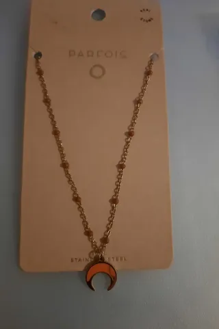 Conjunto de bisutería de la marca Parfois y pendientes portugueses - Gargantilla Parfois. Completamente nueva. Sin usar. Cadena dorada. Material en acero inoxidable. Material duradero, resistente al agua y a la oxidación. Diseño luna invertida. Es un símbolo antiguo que significa protección, salvaguarda de las malas energias y revitaliza la energía femenina. A mitad de precio de su coste: 7 € _ Pulsera dorada de acero inoxidable y una hermosa piedra verde en el centro. A mitad de precio: 5€ Pendientes Portugueses:(Lote 10€) - Pendientes de botón con diseño de árbol de la vida. 3€ - Pendientes de botón con diseño floral. 3€. Los