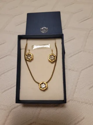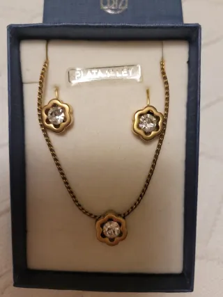 Elegante conjunto de joyería compuesto por pendientes y gargantilla. - Diseño de flor con circonita central. - Plata dorada. - Incluye caja de presentación.