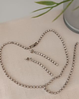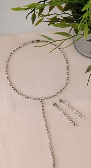 Conjunto de gargantilla y pendientes. Compuesto por tiras con apliques de cristales. Fabricados en acero y golfi anti alergias. Usados solo para un evento.