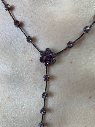 precioso conjunto de gargantills y pendientes en color plata y piedras moradas, en acero, queda muy elegante puesto, ideal pars regalar