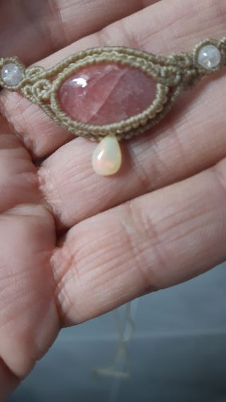 Preciosa gargantilla tejida en micromacrame con una rodocrosita, bolitas de piedra luna y minilagrima de opalo etiope