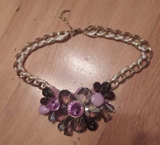 Gargantilla de acero con colgantes de piedras en color morado.Se ha usado un día en una celebraciòn.Ha estado guardada y está como el primer dia sin oxidarse.Está nueva,impecable. Medidas : La cadena mide 43 cmts y los colgantes de las piedras moradas cuelgan 6,5 cmts de largo