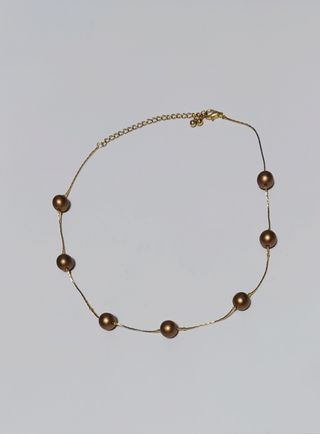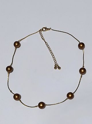 Preciosa gargantilla de color dorado con forma de perlas de color bronce. Es una pieza elegante y delicada. - Cadena fina de metal dorado. - Siete perlas de tamaño mediano. - Cierre de mosquetón. - Cadena de longitud ajustable. - Mide 48 cm de largo total.