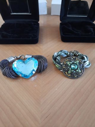 Las pulseras están nuevas, es un regalo que me hicieron que no uso, están sin estrenar. Al que le guste esta artesania acierta, son muy bonitas. También se pueden poner como gargantilla con una cadena y es muy fácil de enganchar. Vienen en su caja de terciopelo negra.