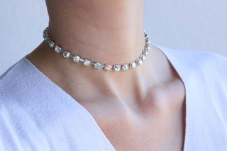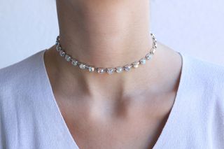 Collar gargantilla metálica elegante con piedras trasparente y azul de 46 cm de largo