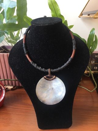 Preciosa gargantilla de estilo boho chic. Ideal para darle un toque único a tu look. - Elaborado con nácar y piel. - Diseño circular con colgante de nácar. - Cordón trenzado de cuero marrón y hilo negro.