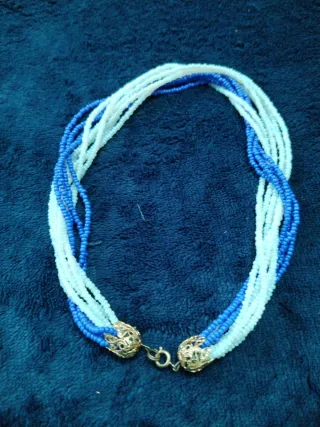 Elegante collar antiguo tipo gargantilla con un diseño de múltiples hilos entrelazados. - Elaborado con pequeñas cuentas. - Cierre metálico dorado.