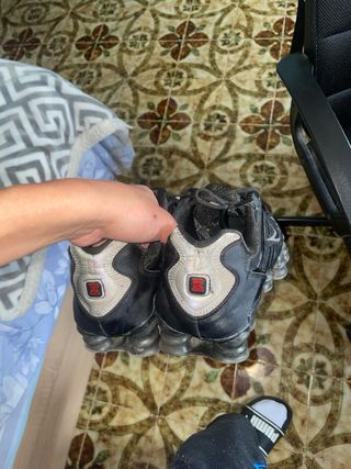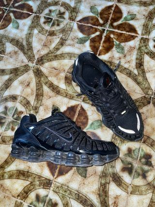 Zapatillas Nike Shox en color negro. Diseño deportivo y moderno. - Parte superior de malla transpirable. - Suela con tecnología Shox para amortiguación. - Cierre de cordones.