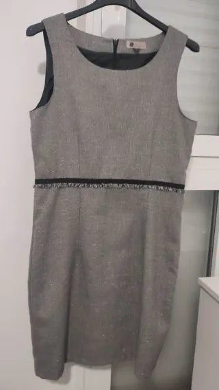 Vestido de mujer en color gris, talla 38. Diseño elegante con detalles. - Tejido con hilo plateado. - Detalle de cinta negra con flecos en la cintura. - Cremallera oculta en la espalda.