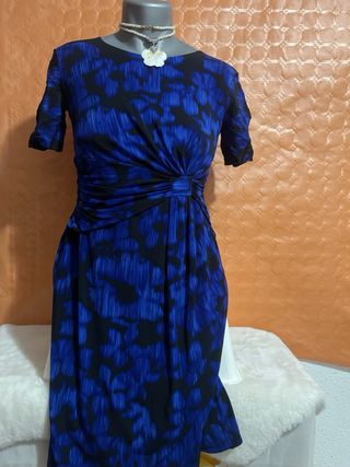 Vestido corto con un llamativo estampado abstracto en tonos azules y negros. Presenta un diseño drapeado en la cintura que estiliza la figura. - Escote redondo. - Mangas cortas. - Tejido ligero y fluido.